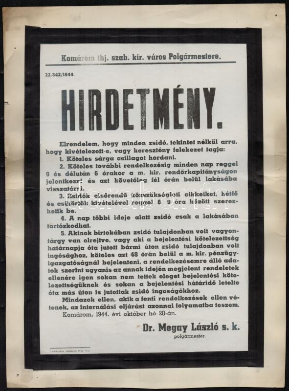 1946 Közvetlenül a II. világháború után mementóként rendezett kiállításra készített korabeli fotómásolat kartonon a Komáromban 1944-ben kifüggesztett zsidóellenes hirdetményről, 31×22 cm