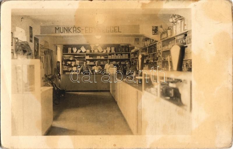 Leírás: Ismeretlen magyar település, üzlet belső eladókkal és falnak támasztott kerékpárokkal, "Munkás-egységgel" felirat. photo (non PC) (fl)
