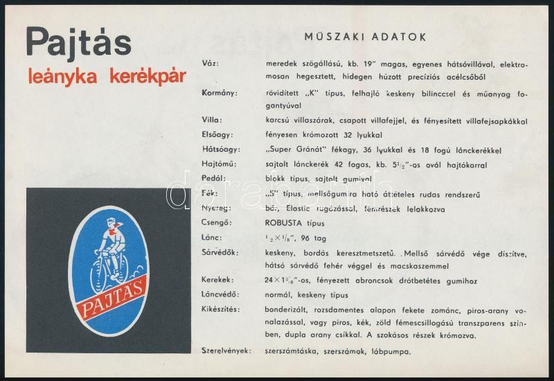 Leírás: cca 1960 A Csepel Pajtás leányka kerékpár műszaki tájékoztatója