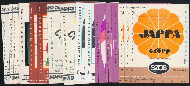 7 féle Szobi-üdítőital címke (Jaffa szörp, szamóca szörp, stb.), összesen 21 db