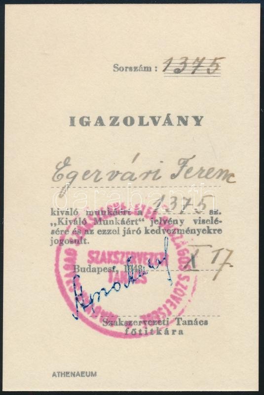 1948 "Kiváló Munkáért" jelvény viselésére jogosító igazolvány, bélyegz...