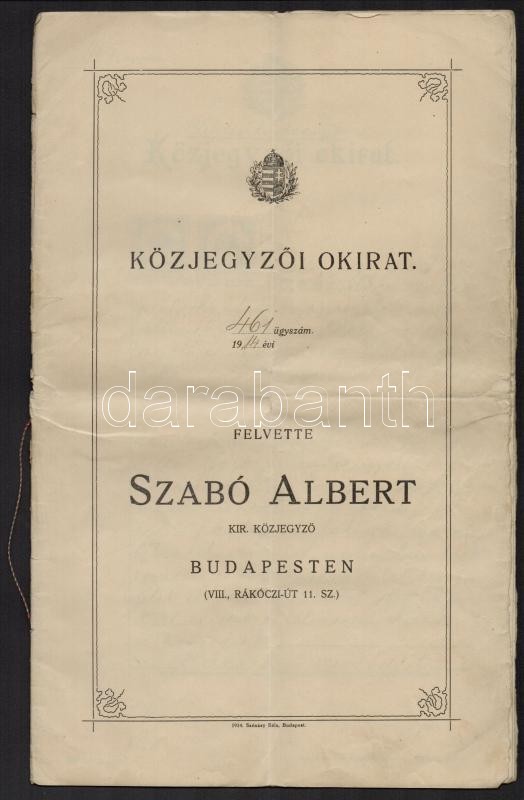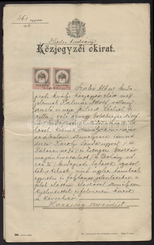 1914 Közjegyző által hitelesített házassági szerződés, okmánybélyegekk...