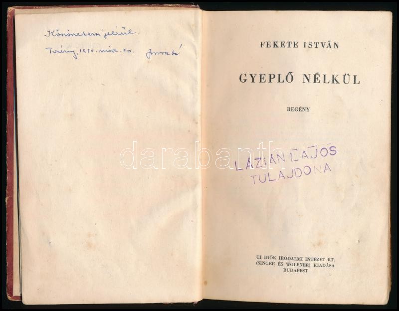 Fekete István: Gyeplő nélkül. Bp.,1947,Új Idők (Singer és Wolfner.) Első kiadás. Kiadói félvászon-kötés, kopott borítóval, ajándékozási sorokkal, névbélyegzővel.
