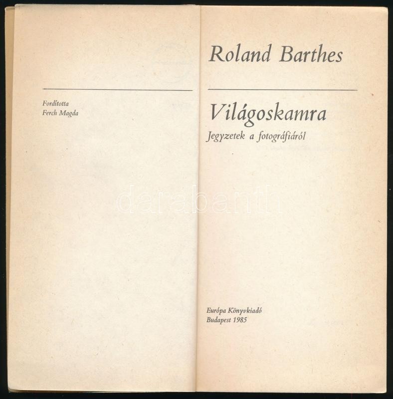 Leírás: Roland Barthes: Világoskamra. Jegyzetek a fotográfiáról. Fordította: Ferch Magda. Mérleg. Bp., 1985, Európa. Kiadói papírkötés.