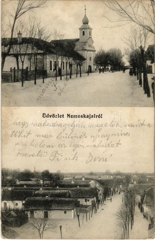1913 Nemeskajal, Kajal; utca, templom / street, church https://www.darabanth.com/hu/354-Gyorsarveres/354.0/Kepeslapok/Felvidek~1000007/1913-Nemeskajal-Kajal-utca-templom-street-church~II2022597