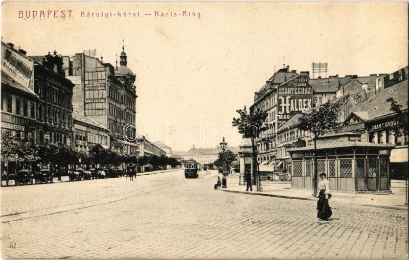 Leírás: 1908 Budapest V. Károlyi körút, Diana Gyógyszertár, Papírnemű gyár, lámpaárugyár, villamos, Haldek szőnyegház (EK)