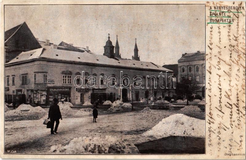 1915 Budapest V. Városház tér télen, A kegyesrendiek épülete, Világ Panoráma, Mozgó mozi, Barhó Ferenc üzlete