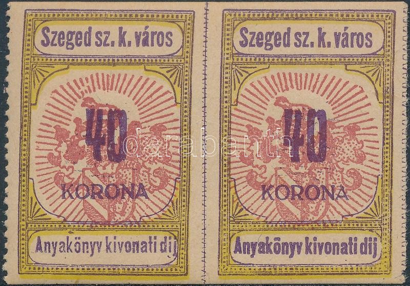 1920 Szeged városi anyakönyvi kivonati díj bélyegek párban 40 K (bal oldali bélyeg fogazott) (23.000)