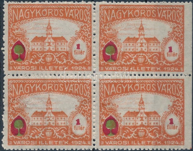 Leírás: 1924 Nagykőrös városi illetékbélyeg négyestömb 1f, jobb oldalon vágott (9.500)