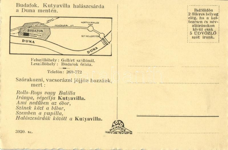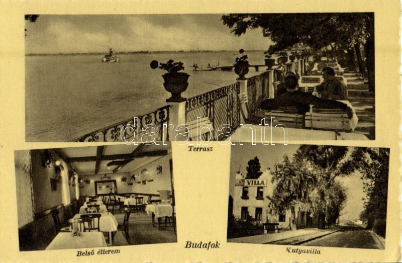 Leírás: Budapest XXII. Budafok, Kutyavilla halászcsárda a Duna mentén, terasz, belső étterem, reklámlap (EK)