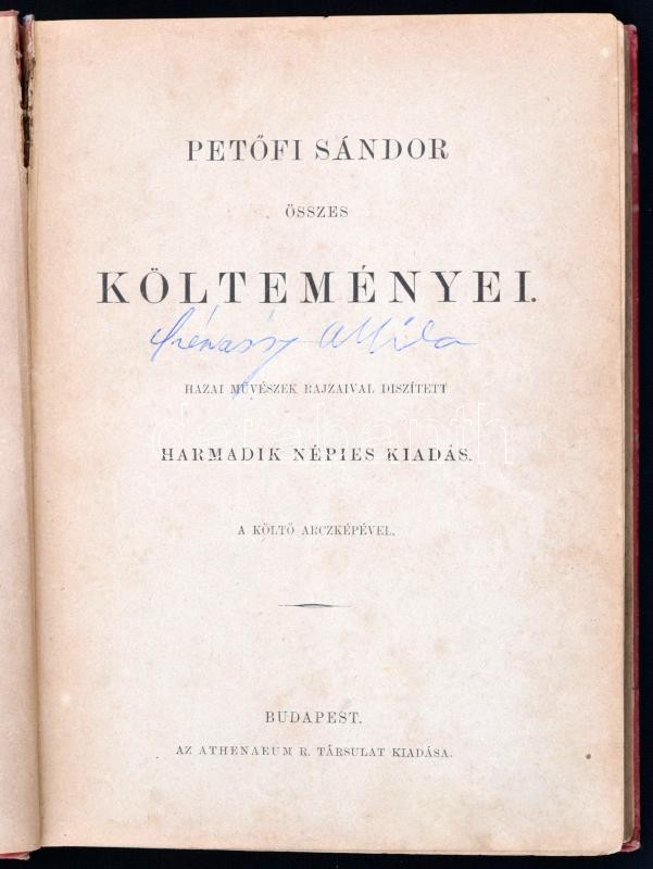Petőfi Sándor összes költeményei. Hazai művészek rajzaival díszített harmadik népies kiadás. Bp., Athenaeum. Kiadói festett, egészvászon kötés, gerincnél szakadt, foltos, viseltes állapotban.
