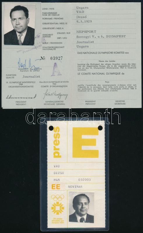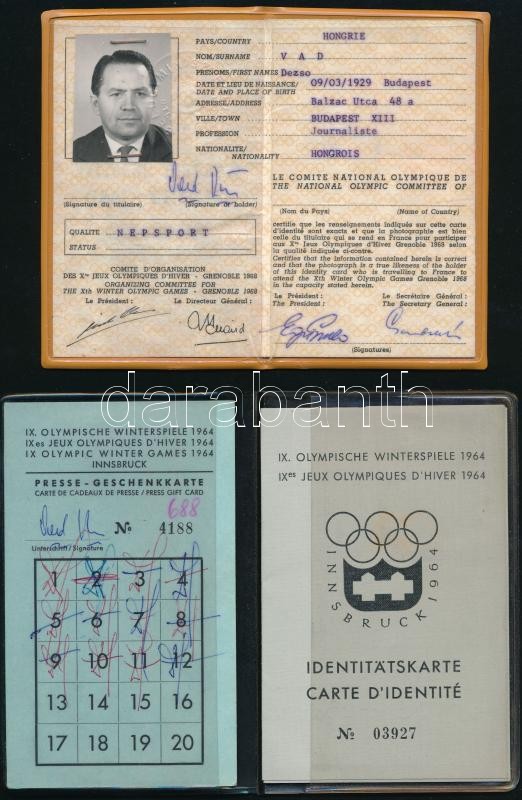 1960-1984 Téli olimpiára szóló sajtóbelépők magyar újságíró részére 3 ... https://www.darabanth.com/hu/360-Gyorsarveres/360.0/Mutargy-papirregiseg-egyeb/Okmanyok~500017/1960-1984-Teli-olimpiara-szolo-sajtobelepok-magyar-ujsagiro-reszere-3-db-Press-id-s-f~II2046371