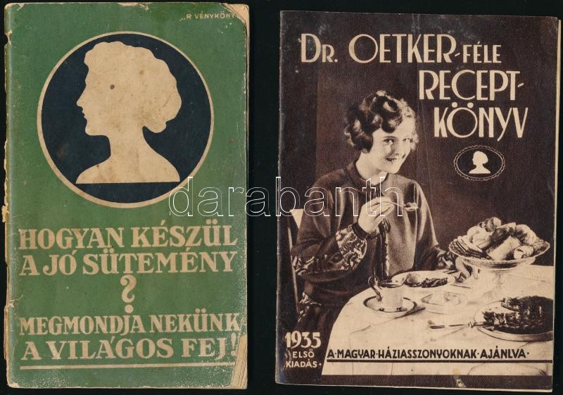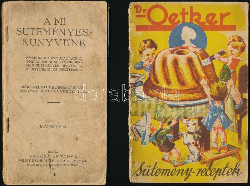 Vegyes recept- és süteményes füzet, 4 db: Dr. Oetker-féle receptkönyv. Bp., 1935., Tolnai, 15+1 p. Első kiadás. Papírkötésben.; Dr. Oetker sütemény-receptek, kissé kopott, kissé szakadt borítóval, kissé foltos, 30 p.; Hogyan készül a jó sütemény? Megmondja nekünk a világos fej. Bp., én., Dr. Oetker, 96 p. Papírkötésben, foltos, kissé szakadt borítóval, ceruzás bejegyzésekkel.; A mi süteményes könyvünk. Gyakorlati útmutatások a torták, mignonok és mindenféle sütemények helyes elkészítésére és díszítésére. Bp., 1928, Váncza és Társa, 76 p. Hatodik kiadás. Borító nélkül.