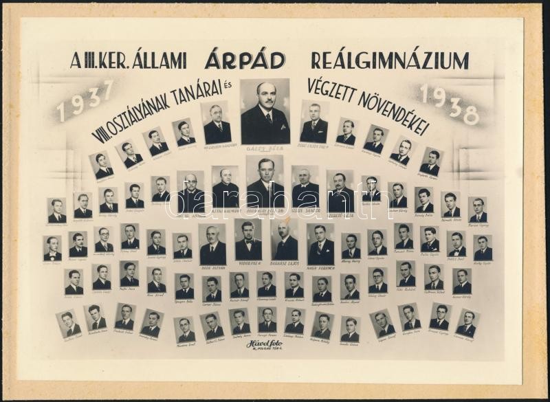 1938 Budapest, a III. ker., Állami Árpád Reálgimnázium tanári kara és végzett növendékei, kistabló nevesített portrékkal, Hável fotó műterméből, 16,5x23 cm, karton 18x24,5 cm