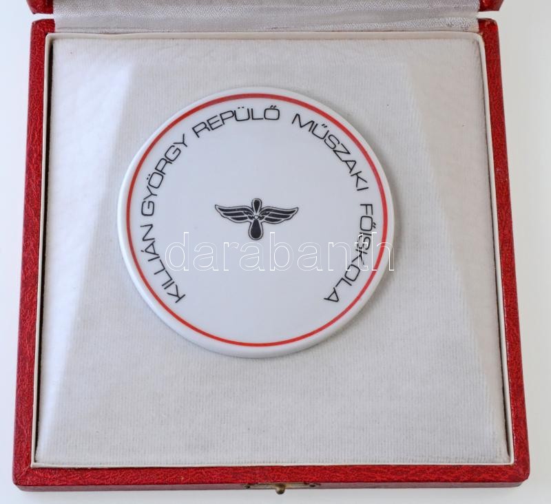 Leírás: ~1950-1960. "Kilián György Repülő Műszaki Főiskola" festett, hátoldalán jelzett Hollóházi porcelán plakett, eredeti tokban (88mm) T:1-