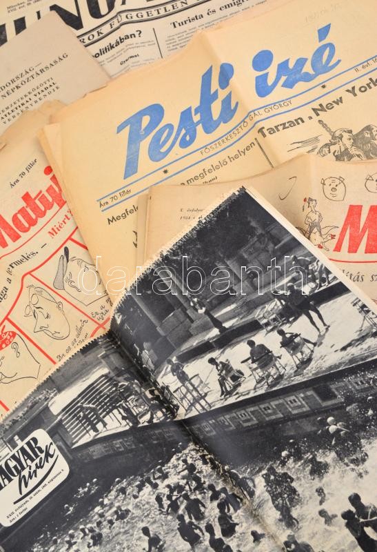 cca 1947-59 vegyes újság és nyomtatvány tétel: Pesti izé 1947, I.. évf., 16. szám, borítóján Hitlert ábrázoló karikatúrával, szakadt és hiányos. Ludas Matyi 2 db száma, 1954. Népsport 1954. július 18. száma. Új Hungária, Műnchenben kiadott jobboldali emigráns hetilap 1969. július 18. száma. Magyar Hírek, 1969. augusztus 9. száma. Svédország - magyar Népköztársaság nemzetekközötti atlétikai viadal versenyrendje. Bp., 1953. szeptember 12-13, Népstadion (A Népstadion 1953. aug. 20. avatása után ez a rendezvény az elsők között lehetett). Eredmények ceruzával részben kitöltve. 14p. Jó állapotban.