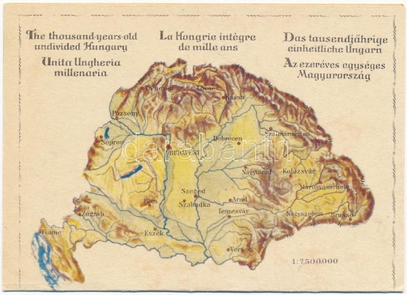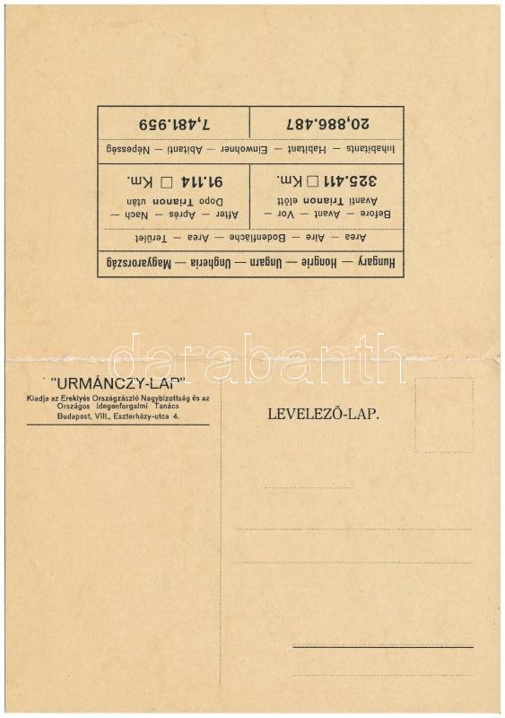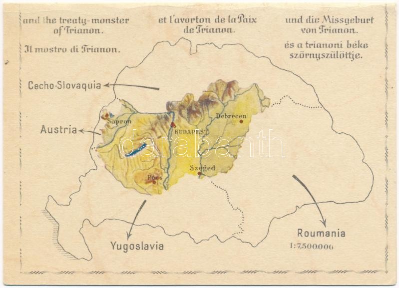 Az ezeréves egységes Magyarország és a trianoni béke szörnyszülöttje: Trianon előtt és után; kihajtható képeslap. Urmánczy-Lap, kiadja Az Ereklyés Országzászló Nagybizottság és az Országos Idegenforgalmi Tanács / irredenta map of Hungary before and after the Treaty of Trianon, folding card