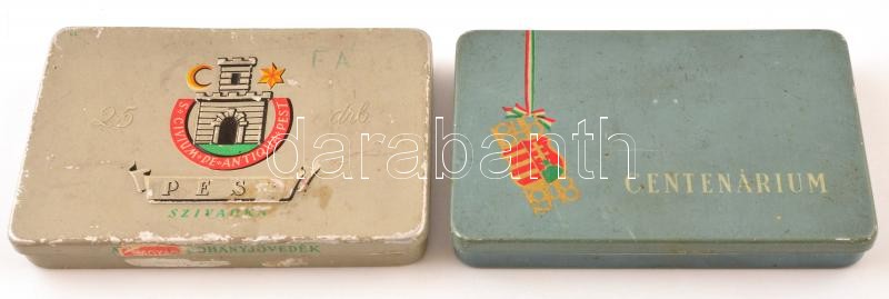 Leírás: 1 db fém szivarka doboz, 1848-1948 centenárium felirattal, enyhén kopott, 1 db Pest szivarka fém doboz, erősen kopott, ca. 7x11 cm