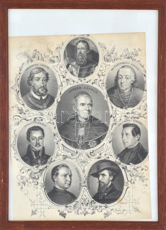 1854 Egri hírességek, Eger város életében fontos szerepet játszó emberek kőnyomatos portréja. Pyrker János László, Telekesy István, gr. Eszterházy Károly, Szvorényi József, Vitkovics Mihály, Tárkányi Véla, Kovács Mihály. Dobó István. 19x26 cm Üvegezett keretben.