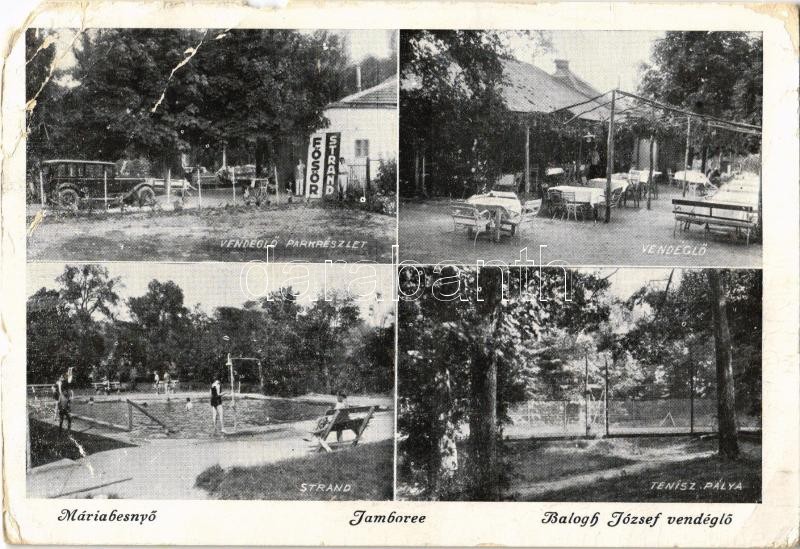 Leírás: 1933 Máriabesnyő (Gödöllő), Vendéglő, étterem, automobil, strand, fürdőzők, teniszpálya, sport, cserkész jamboree (EM)