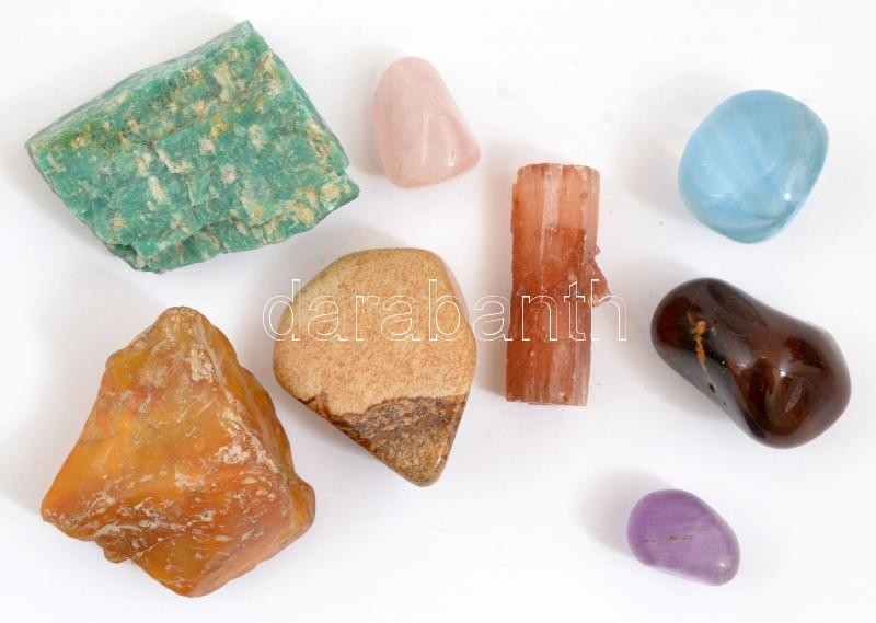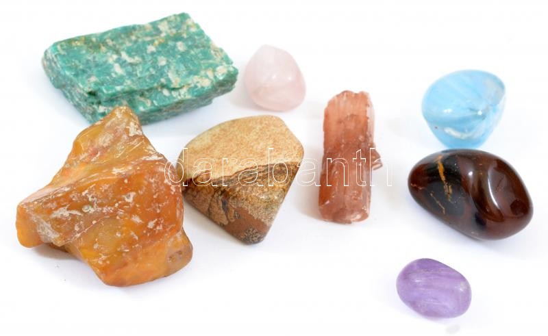 Leírás: 8 db ásvány dobozban, közte amazonit és aragonit