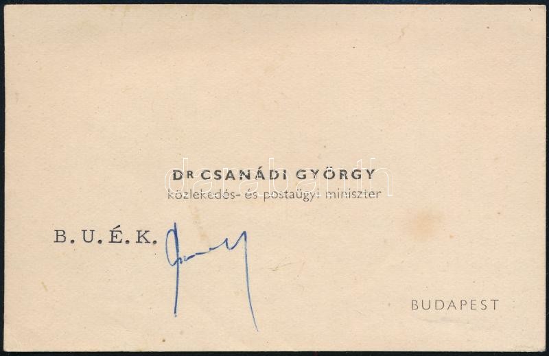 Dr. Csanádi György (1905-1974) közlekedés- és postaügyi miniszter aláí... https://www.darabanth.com/hu/372-Gyorsarveres/372.0/Mutargy-papirregiseg-egyeb/Alairas~19/Dr-Csanadi-Gyorgy-1905-1974-kozlekedes-es-postaugyi-miniszter-alairasa-nevjegykartya~II2173705
