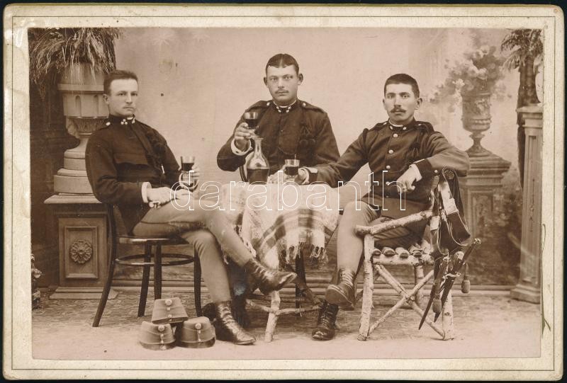 Leírás: cca 1910 Kőszeg, italozó katonák, keményhátú fotó Kis Antal műterméből, 10,5×16 cm