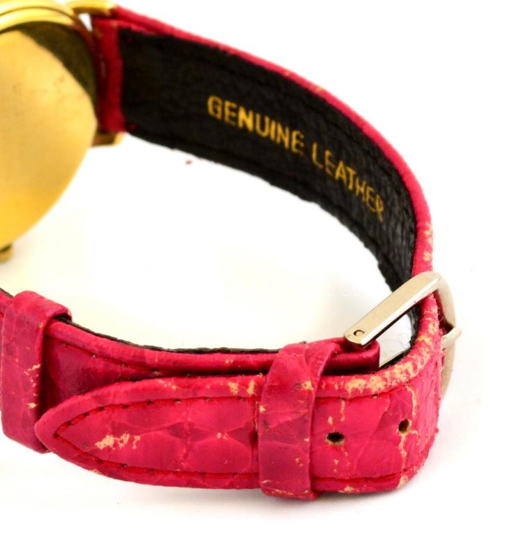 Leírás: Raymond Weil 18K aranyozott óra, kvarc, működik, jelzett, bőr szíja enyhén kopottas, üveglapon karcolások, d: 3 cm