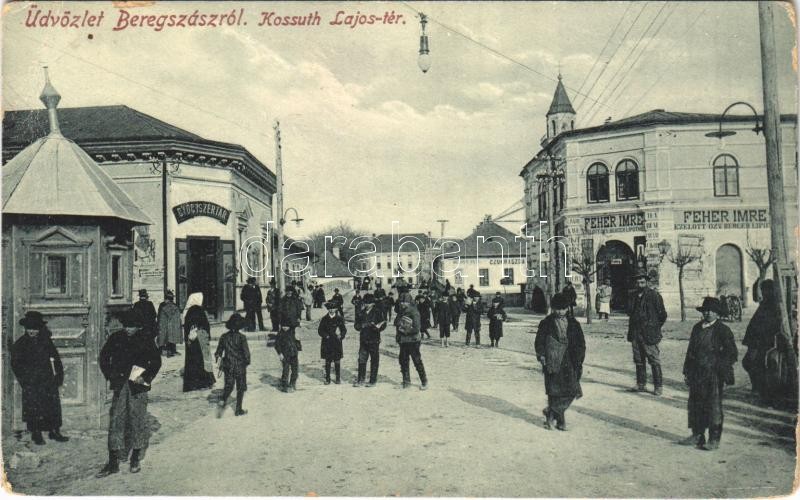 1912 Beregszász, Beregovo, Berehove; Kossuth Lajos tér, Gyógyszertár, Vagányi Antal cukrászdája, Fehér Imre (ezelőtt Özv. Berger Lipótné) üzlete. W. L. Bp. 6058. / square, pharmacy, confectionery, pastry shop (EB)