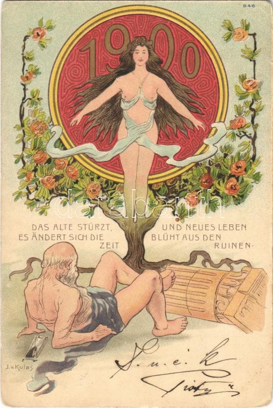 Leírás: 1900 Das alte stürzt, es ändert sich die Zeit und neues Leben blüht aus den Ruinen / Art Nouveau, erotic lady. litho s: J. v. Kulas