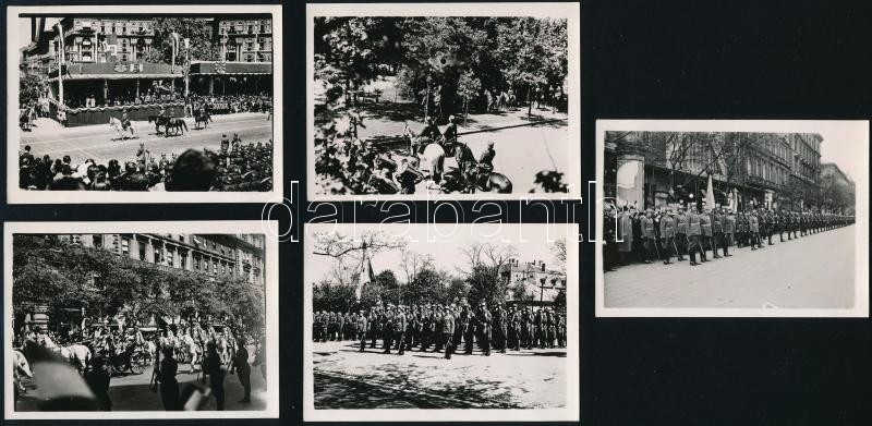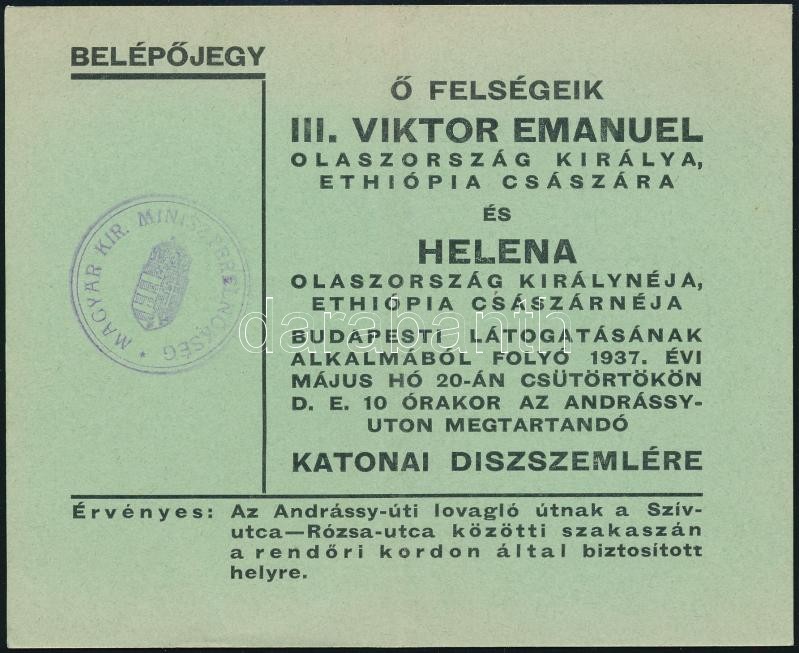 1937 III. Viktor Emánuel (1869-1947) olasz király és felesége Helena ( Petrović-Njegoš Ilona montenegrói királyi hercegnő) budapesti látogatása alkalmából rendezett katonai díszszemlére szóló meghívó és 5 db fotó a díszszemléről, rajta a királyi páhollyal, jó állapotban, fotó: 6,5×8,5 cm