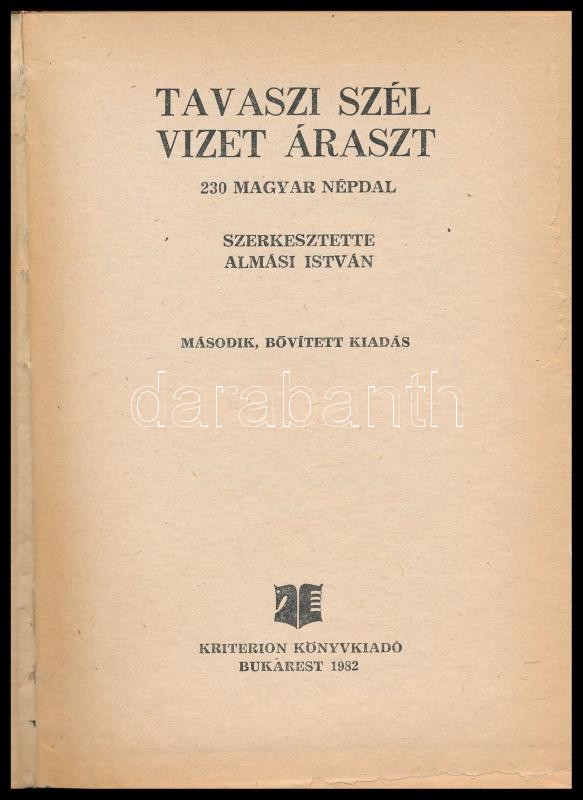 Tavaszi szél vizet áraszt.230 magyar népdal. Szerk.: Almási István. Bukarest, 1982., Kriterion. Második, bővített kiadás. Kiadói félvászon kötés.