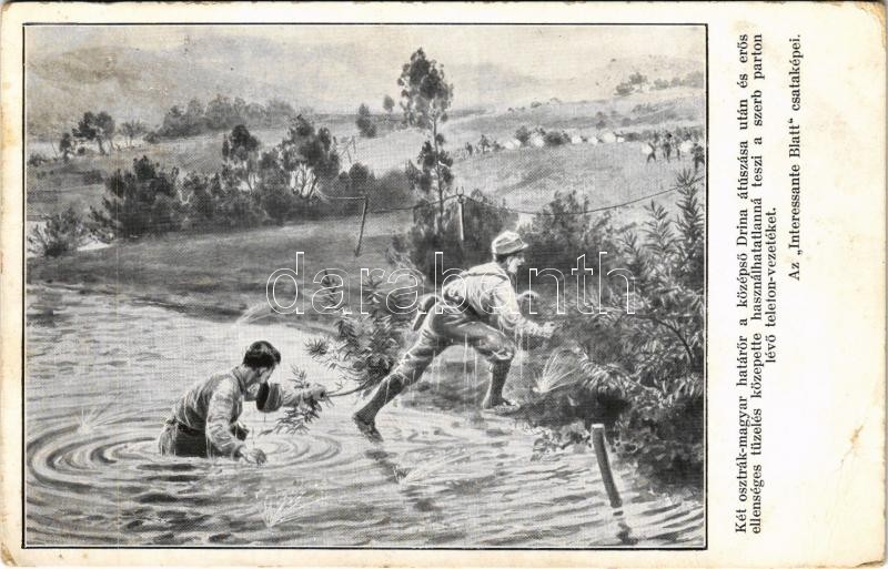 1914 Két osztrák-magyar határőr a középső Drina átúszása után és erős ellenséges tüzelés közepette használhatatlanná teszi a szerb parton lévő telefonvezetéket. Az "Interessante Blatt" csataképei / WWI Austro-Hungarian K.u.K. military, border guards render the telephone line on the Serbian coast unusable. Wiener Rotophot Nr. 9. (EB)