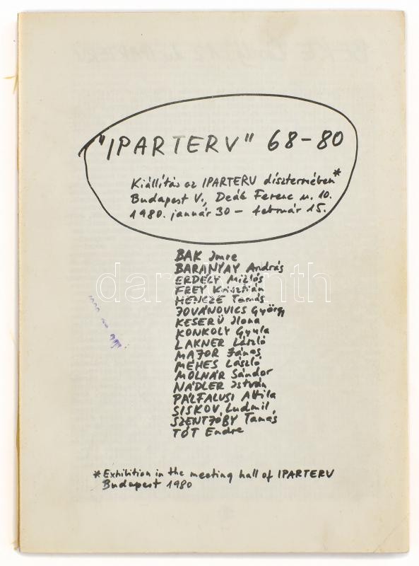 Iparterv 68-80. KiállÃtás az Iparterv dÃsztermében. Bp., é.n. (1980), Iparterv házi nyomdája. Készült 500 példányban. Fekete-fehér képekkel, többek közt Bak Imre, Hencze Tamás, Keserü Ilona, Lakner László, Nádler István 1968-ban, 1969-ben és 1980-ban az Iparterv épületében rendezett kiállÃtásokon szerepelt műveinek reprodukcióival gazdagon illusztrált. Kiadói papÃrkötés, sérült, ragasztott gerinccel. Ritka!
