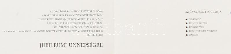 A magyar iparjogvédelem 75 éve. Szerk.: Himer Zoltán, Dr. Szilvássy Zoltán. H.n., 1970, Országos Találmányi Hivatal. 549. számozott példány. Egészvászon-kötésben, szakadt papír védőborítóval, jó állapotban. + Meghívó az Országos Találmányi Hivatal 75. jubileumi ünnepségére
