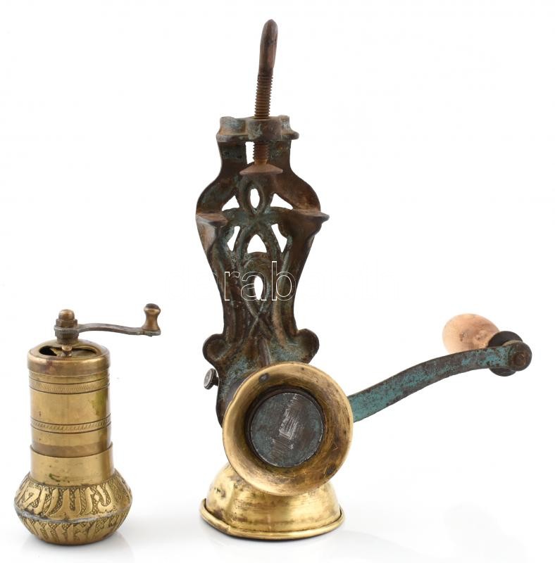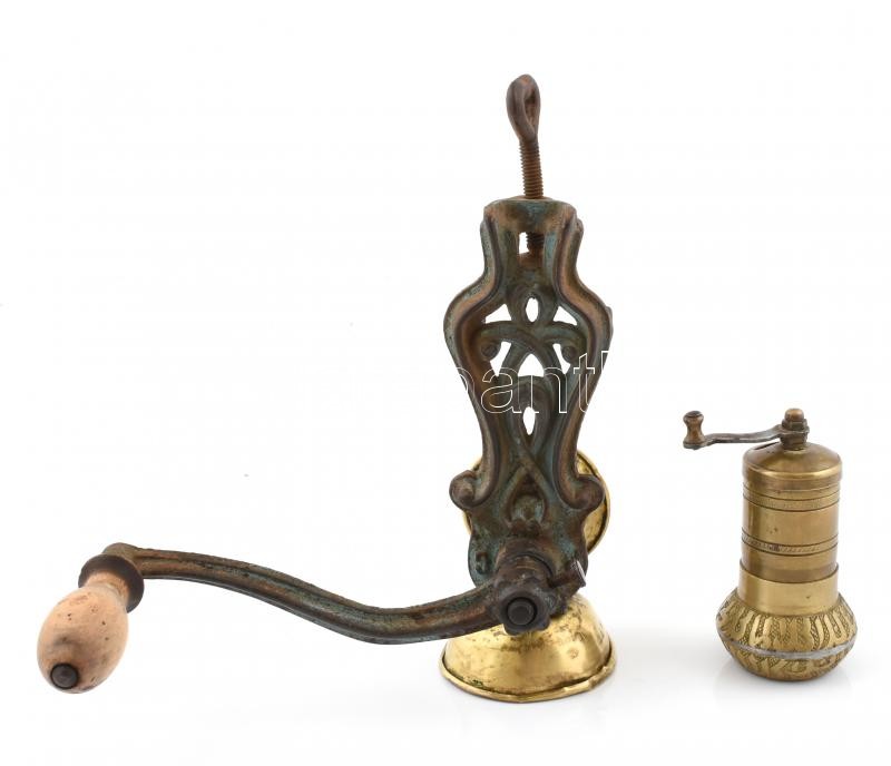 Leírás: cca 1930 Antik fém mákdaráló, kopott, rozsdafoltokkal, 22x6x16 cm + réz borsdaráló betéttel, m: 10 cm