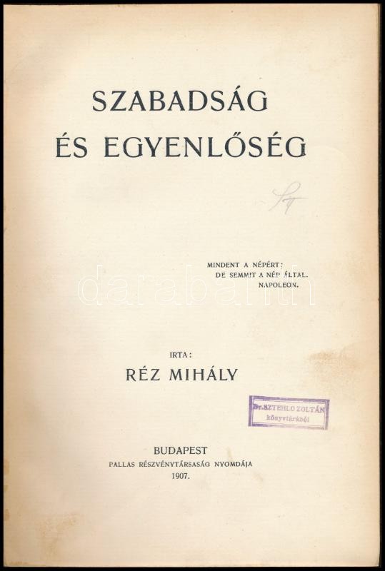 Réz Mihály: Szabadság és egyenlőség. Bp., 1907, Pallas. Átkötött félvászon-kötésben. 'Dr. Sztehlo Zoltán (1889-1975)' jogász, egyetemi tanár névbélyegzőjével.