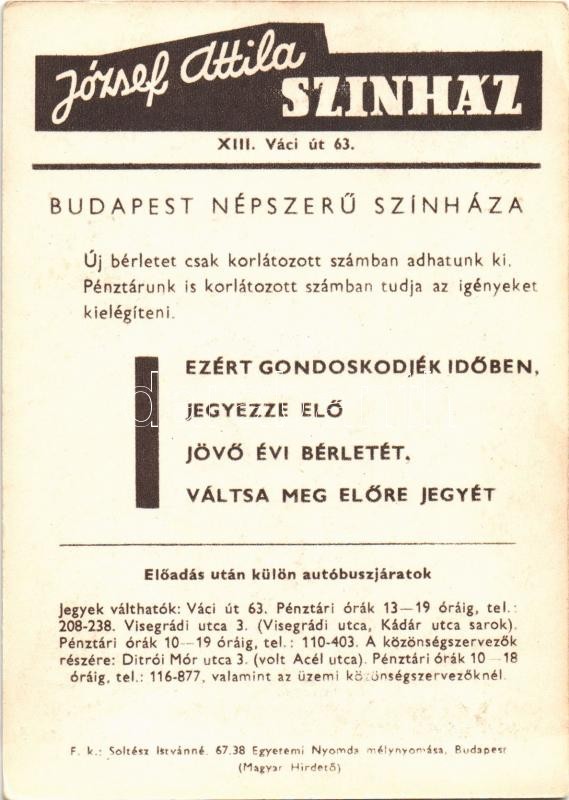 Leírás: Bárány Frigyes. József Attila színház (Budapest XIII. Váci út 63.) reklámlapja (non PC) (EK)