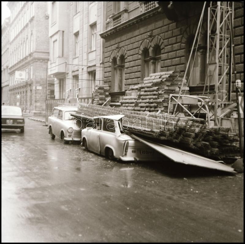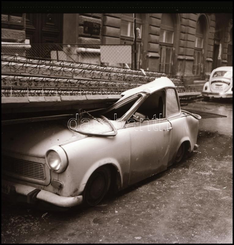 Leírás: 1981 Budapest, Szófia utca, egy összetört Trabant, amelyre vélhetően rádőlt a ház tatarozásához felállított állványzat, 12 db vintage NEGATÍV, 6x6 cm