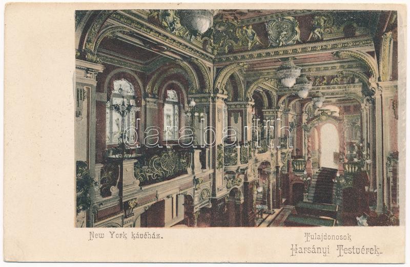 Budapest VII. New York kávéház, belső. Tulajdonosok Harsányi testvérek... https://www.darabanth.com/hu/398-Gyorsarveres/398.0/Kepeslapok/Magyarorszag~1000004/Budapest-VII-New-York-kavehaz-belso-Tulajdonosok-Harsanyi-testverek-azott-wet-damage~II2427263