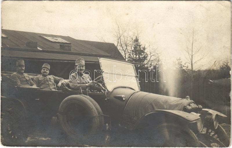 1915 Osztrák-magyar katonák automobilban / WWI Austro-Hungarian K.u.K. military, soldiers in a car. photo + "K.u.K. Chef des Feldtelegraphen-Wesens" (gyűrődés / crease)