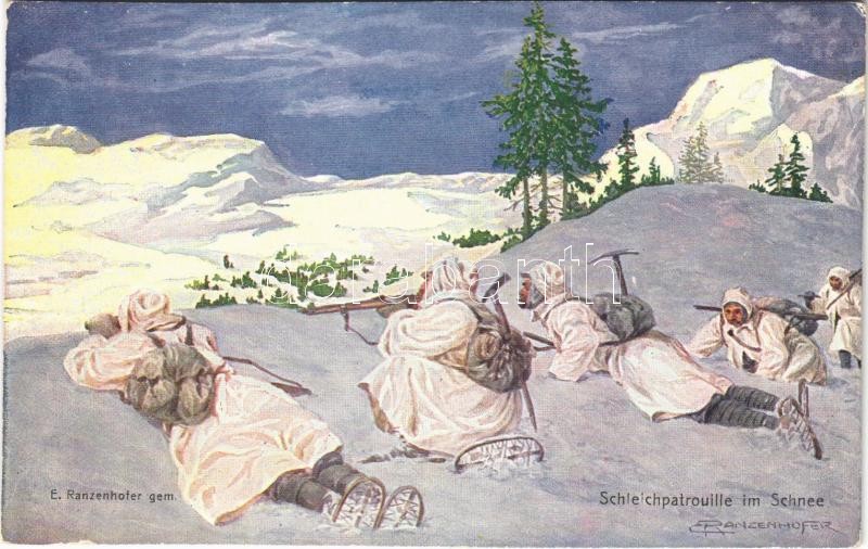 Schleichpatrouille im Schnee. Offizielle Karte für Rotes Kreuz. Kriegsfürsorgeamt Kriegshilfsbüro Nr. 526. / WWI Austro-Hungarian K.u.K. military art postcard, support fund, stealth patrol in the snow s: E. Ranzenhofer