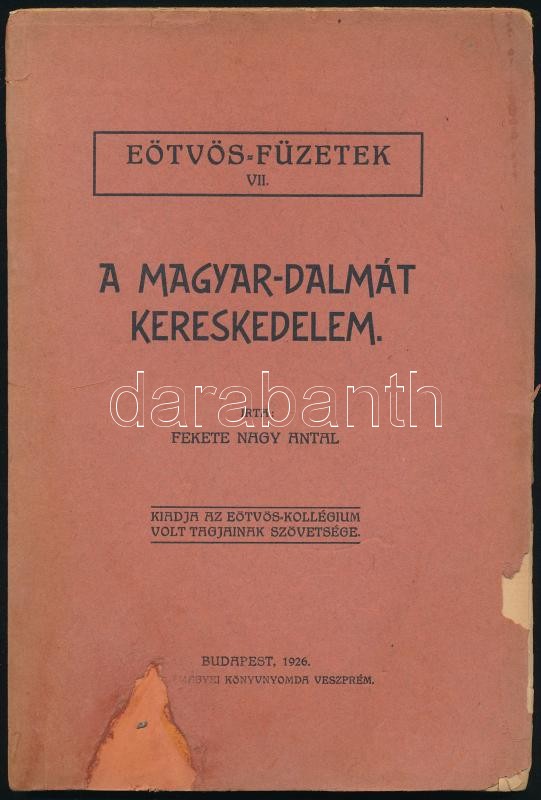 Fekete Nagy Antal: A magyar-dalmát kereskedelem. Eötvös Füzetek VII. Bp., 1926., Eötvös-Kollégium Volt Tagjainak Szövetsége, 90+1 p. Kiadói papírkötés, kissé sérült, javított borítóval.