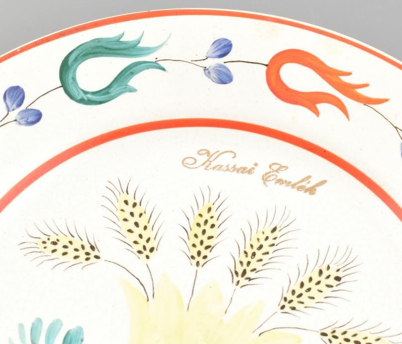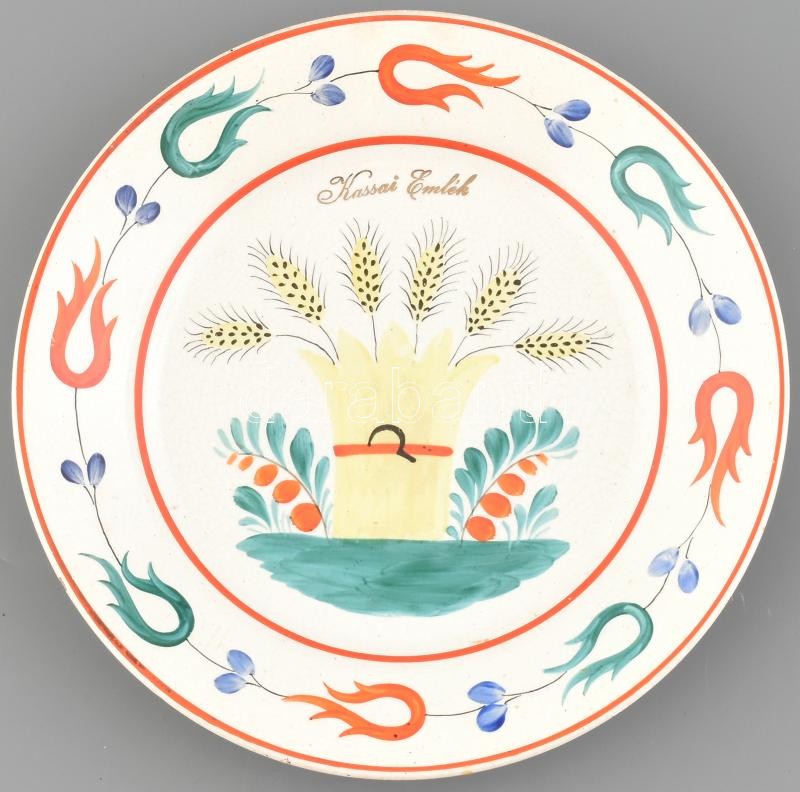 Leírás: Hollóházi kerámia fali tányér "Kassai Emlék" felirattal, kézzel festett, jelzett, kopásnyomokkal, mázhibákkal, d: 23 cm