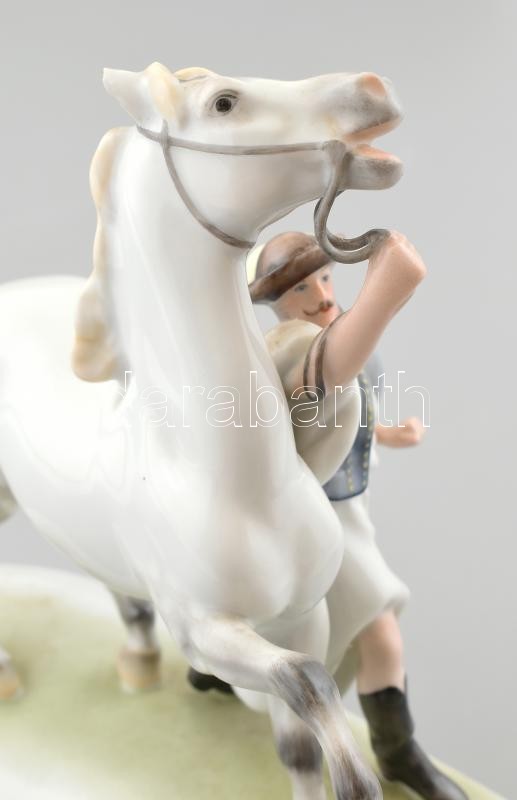 Leírás: Herendi lovát fékező csikós legény, kézzel festett, jelzett, sérült: ló füle, m: 20 cm, h: 19 cm