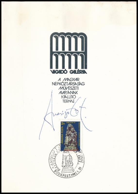 1982 Amerigo Tot (1909-1984) szobrászművész aláírása a Vigadó Galériában rendezett kiállításának emléklapján, alkalmi bélyegzéssel