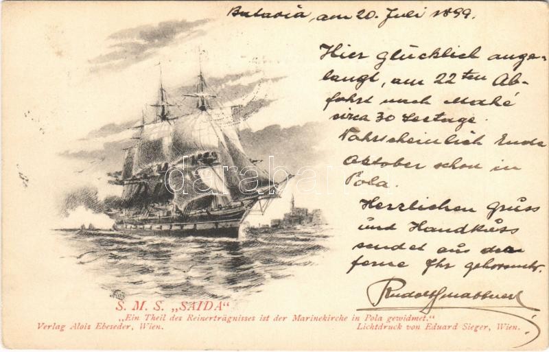 1899 SMS Saida Schraubenkorvette. Ein Teil des Reinerträgnisses ist der Marinekirche in Pola gewidmet. Verlag Alois Ebeseder. Lichtdruck von Eduard Sieger / Austro-Hungarian Navy, K.u.K. Kriegsmarine, SMS Saida screw corvette / Az Osztrák-Magyar Haditengerészet SMS Saida vitorlás korvettje