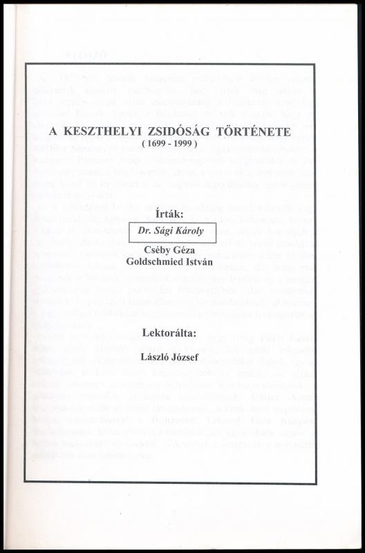 Leírás: Sági Károly-Cséby Géza-Goldschmied István: A keszthelyi zsidóság története. (1699-1999.) Keszthely, 1999, Keszthelyi Izraelita Hitközség. Kiadói papírkötés, egy lapon aláhúzásokkal. Megjelent 300 példányban.