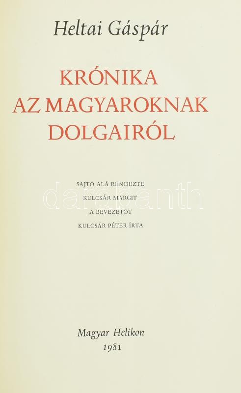 Heltai Gáspár: Krónika az magyaroknak dolgairól. Szerk.: Kulcsár Margit. A bevezetÅ‘t Ãrta: Kulcsár Péter. Bp., 1981, Magyar Helikon. 475 p. Kiadói egészvászon-kötés, kiadói papÃr védÅ‘borÃtóban.