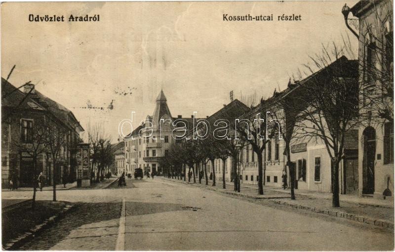 Leírás: 1923 Arad, Kossuth utca, gyógyszertár, Holländer Illés üzlete / street, pharmacy, shops